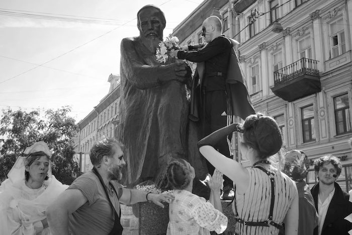 Ρώσοι ηθοποιοί αφήνουν λουλούδια στο άγαλμα του Φιόντορ Ντοστογιέφσκι την Ημέρα του Ντοστογιέφσκι. Το άγαλμα είναι δίπλα στο σπίτι του στο St. Petersburg AP