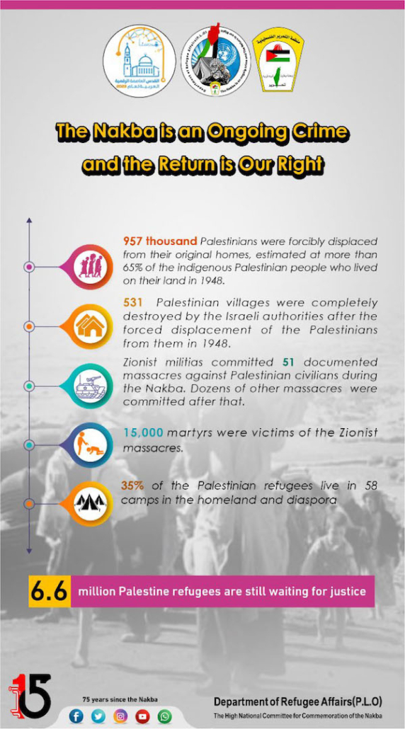Οι Παλαιστίνιοι σε όλο τον κόσμο σηματοδοτούν την Ημέρα της Νάκμπα ή την «καταστροφή» κάθε χρόνο στις 15 Μαΐου, όταν πριν από 75 χρόνια 15.000 Παλαιστίνιοι σκοτώθηκαν και 531 χωριά και κωμοπόλεις ισοπεδώθηκαν εντελώς και όταν 957.000 Παλαιστίνιοι εκτοπίστηκαν διά της βίας από τις πατρογονικές τους εστίες στην Παλαιστίνη, (πάνω από το 65% των αυτόχθονων Παλαιστινίων που ζουν στη γη τους το 1948), οδηγώντας στην απομάκρυνση, στον εκτοπισμό και την άρνηση του αναφαίρετου δικαιώματος των Παλαιστινίων στην αυτοδιάθεση.