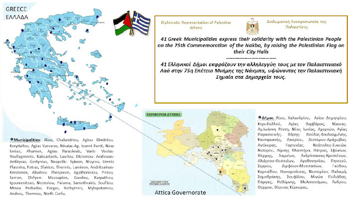 Ο Επιτετραμμένος της Διπλωματικής Αντιπροσωπείας του Κράτους της Παλαιστίνης στην Ελληνική Δημοκρατία, ο κ. Yussef Dorkhom δηλώνει ότι «Εκ μέρους της Παλαιστινιακής Ηγεσίας, της Κυβέρνησης και του Παλαιστινιακού Λαού, εκφράζω την ειλικρινή μου ευγνωμοσύνη και εκτίμησή μου προς τους Δημάρχους και τα Μέλη του Δημοτικού Συμβουλίου του Ιλίου, Χαλανδρίου, Αγίου Δημητρίου, Κορυδαλλού, Αγίας Βαρβάρας, Νίκαιας-Αγ.Ιωάννη Ρέντη, Νέας Ιωνίας, Αχαρνών, Αγίας Παρασκευής, Βάρης- Βούλας-Βουλιαγμένης, Καισαριανής, Λαυρίου, Διστόμου-Αράχωβας-Αντίκυρας, Γορτυνίας, Νεάπολης-Συκεών, Νισύρου, Λίμνης Πλαστήρα, Πάτρας, Σφακίων, Θέρμης, Λαμιέων, Ανδρίτσαινας-Κρεστένων, Αλιάρτου-Θεσπιέων, Αγαθονησίου, Πηνειού, Σερρών, Διρφύων-Μεσσαπίων, Γαύδου, Καρπάθου, Ηγουμενίτσας, Νεστορίου, Παλαμά, Σαμοθράκης, Σουφλίου, Μινώα Πεδιάδας, Πάργας, Ρεθύμνης, Μυλοποτάμου, Άνδρου, Θέρμου, Βόρειας Κέρκυρας, οι οποίοι ανταποκρίθηκαν θετικά στο αίτημά μας να υψωθεί η Παλαιστινιακή Σημαία στο κτίριο του Δημαρχείου τους σε ένδειξη αλληλεγγύης και υποστήριξης προς τον Παλαιστινιακό λαό που τιμάει σήμερα την 75η Επέτειο Μνήμης της Nakba ή της «καταστροφής» της 15ης Μαΐου 1948 και πρόσθεσε ότι «αυτή η ευγενής έκφραση αλληλεγγύης εδραιώνει τους ιστορικούς και μακροχρόνιους δεσμούς φιλίας μεταξύ του Ελληνικού και του Παλαιστινιακού λαού που βασίζονται στις κοινές αξίες της Δημοκρατίας, των Ανθρωπίνων Δικαιωμάτων, της Δικαιοσύνης, της Ειρήνης και της Υπεράσπισης των Αρχών του Διεθνούς Δικαίου και της Νομιμότητας».