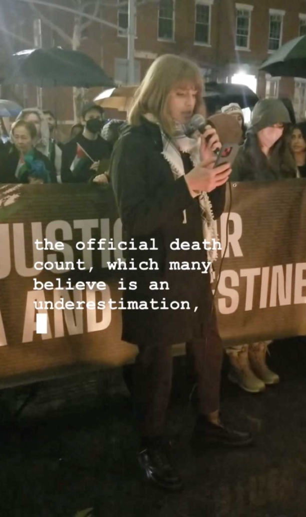 «Συγκεντρωνόμαστε, σε επαγρύπνηση εδώ σε αλληλεγγύη για να αναδείξουμε τις ζωές των επιζώντων… ακόμη και όταν οι ηγέτες αυτής της πόλης, ο Σιωνιστής δήμαρχος μας, στέκεται χέρι-χέρι με το Σιωνιστικό καθεστώς, ακόμη και όταν η ιστορία, τα πολιτιστικά ιδρύματα αυτής της πόλης ασβεστώνουν τη γενοκτονία. Οι New York Times εγκατέλειψαν το ποιητικό τμήμα τους και τυπώνουν ψέματα που ασπρίζουν τη γενοκτονία στις σκουπιδόφυλλές τους. Το 92nd Street Y ακύρωσε τη σειρά ποίησης του και αντ’ αυτού φιλοξενεί κληρονόμους γενοκτονίας για να απολαμβάνουν άνετα να μιλάνε για τη γενοκτονία στις αίθουσες του πολέμου τους.