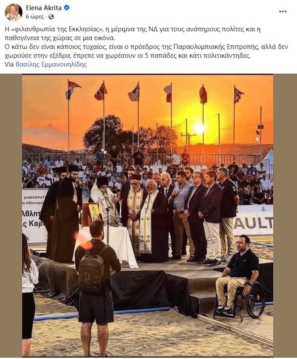«Η ”φιλανθρωπία της Εκκλησίας”, η μέριμνα της ΝΔ για τους ανάπηρους πολίτες και η παθογένεια της χώρας σε μια εικόνα» γράφει η Έλενα Ακρίτα για την εικόνα ντροπής, που έκανε το γύρο του διαδικτύου.
