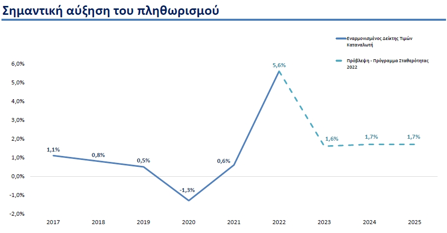 Σύμφωνα με δημοσίευμα του Bloomberg, το οποίο επικαλείται σχετικό έγγραφο της Επιτροπής, η πρόβλεψη για τον μέσο πληθωρισμό στην ευρωζώνη το 2022 αυξάνεται από το 3,5% στο 6,1%. Η νέα, αυξημένη πρόβλεψη δημιουργεί σοβαρές αμφιβολίες για την αξιοπιστία της αντίστοιχης, πρόσφατα αναθεωρημένης πρόβλεψης του ελληνικού ΥΠΟΙΚ, σύμφωνα με την οποία ο πληθωρισμός στην Ελλάδα θα αυξηθεί φέτος στο 5,6%, όπως φαίνεται στο γράφημα που παρουσίασε πρόσφατα στο υπουργικό συμβούλιο ο Χρ. Σταϊκούρας.