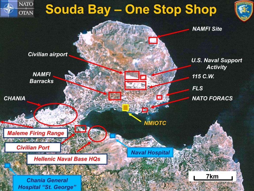 — «Marathi Greek Navy Base». Ο Ναύσταθμος Κρήτης (ΝΚ) του ελληνικού Πολεμικού Ναυτικού. Βρίσκεται σε άλλο σημείο του Κόλπου στο Μαράθι, από εκεί που είναι οι Αμερικανοί.