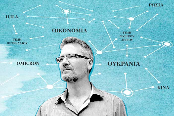 Ως διανοούμενος που σχεδόν μέρα παρά μέρα αρθρογραφεί, μιλάει σε εκπομπές, podcasts και ανεβάζει κείμενα στο δικό του site, το πεδίο των ενδιαφερόντων του είναι ιδιαίτερα ευρύ. Τρία από τα πολύ σημαντικά θέματα στα οποία έχει πέσει πάνω τους η διεισδυτική του ματιά είναι η οικονομική κρίση, η πανδημία και η ρωσική εισβολή.