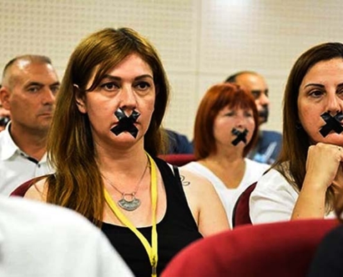 Διαμαρτυρία Τουρκοκύπριων δημοσιογράφων με μαύρες ταινίες στο στόμα για την ελευθερία Τύπου & λόγου