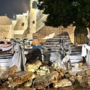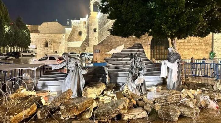 Μπροστά στη βασιλική της Γεννήσεως, φέτος δεν στήθηκε φάτνη: η Μαρία και ο Ιωσήφ αναπαριστώνται με γκρίζα αγάλματα, ανάμεσα σε συντρίμμια, πίσω από αγκαθωτά συρματοπλέγματα.