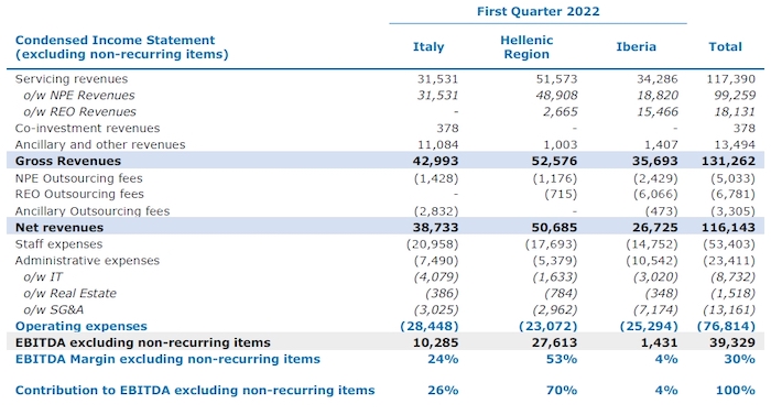 Το πλέον εντυπωσιακό στοιχείο, όμως, είναι το περιθώριο της λειτουργικής κερδοφορίας (EBITDA – Κέρδη προ φόρων, τόκων και αποσβέσεων), που δείχνει ότι η Ελλάδα είναι με διαφορά η πιο αποδοτική αγορά στη διαχείριση δανείων. Ειδικότερα, στην Ελλάδα τα EBITDA ήταν 27,6 εκατ. ευρώ και το περιθώριο κέρδους διαμορφώθηκε σε 53%, συντριπτικά μεγαλύτερο από το 24% στην Ιταλία και το 4% στην Ιβηρική. Το μέσο περιθώριο του ομίλου σε όλες τις περιοχές είναι 30%. Οι ελληνικές δραστηριότητες, έχοντας πολύ υψηλότερο περιθώριο EBITDA, συμβάλλουν κατά 70% στη συνολική λειτουργική κερδοφορία, έναντι 26% για την Ιταλία και 4% για την Ιβηρική.