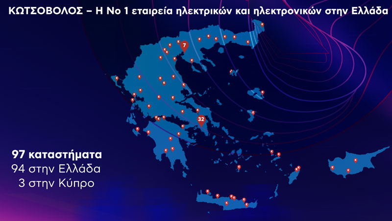 • Κωτσόβολος: Κορυφαίο και ολοκληρωμένο δίκτυο ηλεκτρικών και ηλεκτρονικών προϊόντων, με 97 φυσικά καταστήματα σε Ελλάδα και Κύπρο, εκ των οποίων 27 megastores και πολυκαναλικό (omnichannel) δίκτυο πωλήσεων