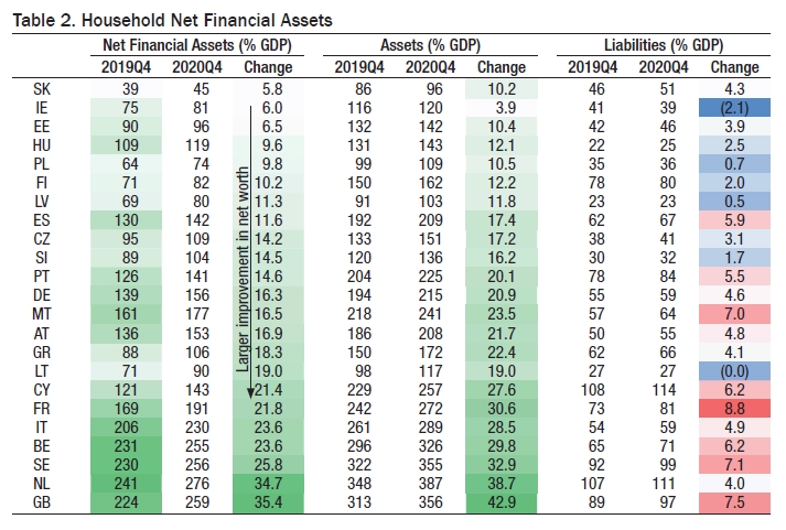 Με βάση τους ορισμούς που υιοοθετεί το Ταμείο, τα ελληνικά νοικοκυριά φαίνεται ότι είχαν το 2020 την ένατη μεγαλύτερη αύξηση καθαρών χρηματοοικονομικών στοιχείων ενεργητικού στην Ευρώπη, καθώς αυτά αυξήθηκαν από 88% σε 106% του ΑΕΠ, δηλαδή κατά 18,3%. Αυτό εξηγείται πρωτίστως από τη μεγάλη αύξηση που σημείωσαν αυτή την περίοδο οι τραπεζικές καταθέσεις. Ειδικότερα, τα στοιχεία ενεργητικού αυξήθηκαν από 150% σε 172% του ΑΕΠ, δηλαδή κατά 22,4%, ενώ οι υποχρεώσεις αυξήθηκαν από 62% σε 66% του ΑΕΠ, δηλαδή κατά 4,1%. Σημειώνεται ότι υπήρξαν και χώρες (Ολλανδία, Βρετανία), όπου η αύξηση της περιουσίας των νοικοκυριών ξεπέρασε το 30%, ενώ σε πέντε χώρες διαπιστώνονται μονοψήφια ποσοστά αύξησης. Κοινός παρονομαστής σε όλες τις χώρες όπου καταγράφεται αύξηση πλούτου των νοικοκυριών είναι ότι εφάρμοσαν μεγάλα προγράμματα κρατικής στήριξης της οικονομίας.