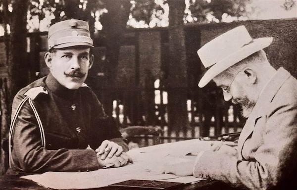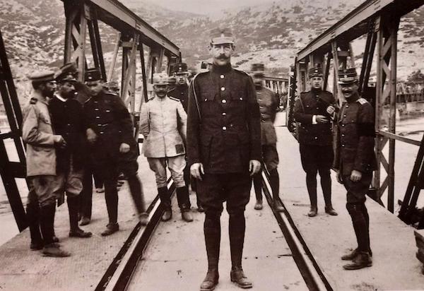 Ο Κωνσταντίνος στη γέφυρα του Δεμίρ Ισσάρ. Πίσω του εικονίζονται οι πρίγκιπες Γεώργιος και Αλέξανδρος
