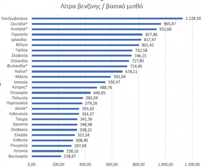 Ενδιαφέρον έχει αν παρατηρήσουμε ότι σε πολλές χώρες της βόρειας Ευρώπης, που ο βασικός μισθός είναι ακόμη και 3 φορές μεγαλύτερος από την Ελλάδα, πχ Λουξεμβούργο 2.257 ευρώ και Σουηδία: 2.153 ευρώ, η βενζίνη είναι φθηνότερη σε σχέση με την Ελλάδα: 2 και 2,23 ευρώ αντίστοιχα!