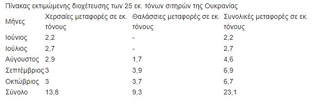 Στο παρελθόν η μέση μηνιαία εξαγωγή σιτηρών της Ουκρανίας ήταν περίπου 5 εκ. τόνοι. Ο συνδυασμός των χερσαίων και θα λάσιων μεταφορών έχει ήδη επιτύχει τον στόχο πριν τον πόλεμο καθώς έχουν εξαχθεί τουλάχιστον 23 εκ από τα 25 εκ του περασμένου Μαΐου.