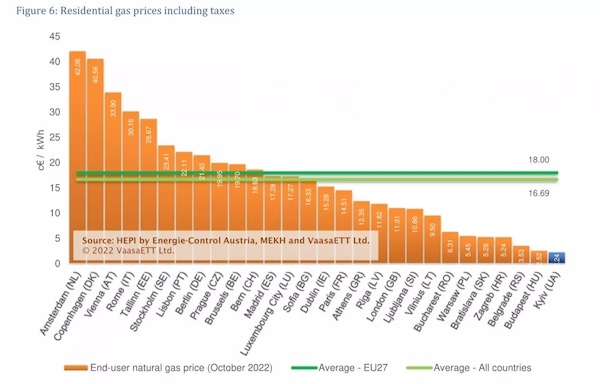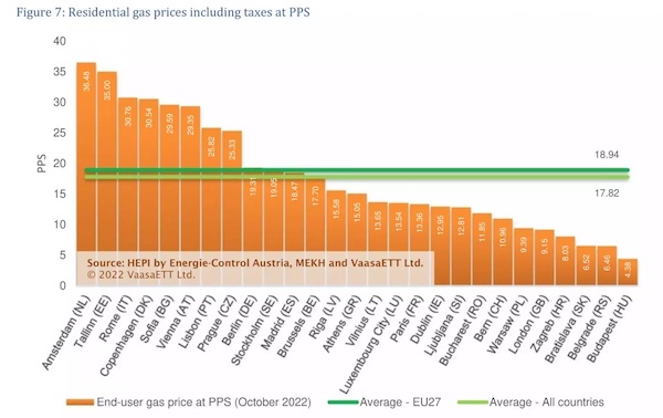 Πιο ακριβή χώρα στο φυσικό αερίο ήταν η Ολλανδία (42,08 σεντ) και πιο φθηνή η Ουγγαρία (2,52 σεντ).