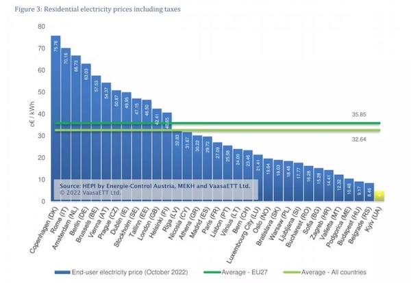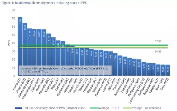 Πάντως, σε ότι αφορά στις τιμές της ηλεκτρικής ενέργειας εκτός νοικοκυριών οι υψηλότερες τιμές καταγράφονται στην Ελλάδα (30 σεντ ανά κιλοβατώρα) και οι χαμηλότερες στη Φινλανδία (8 σεντ ανά kWh) το πρώτο εξάμηνο του 2022, σύμφωνα με τα στοιχεία της Ε. Επιτροπής.