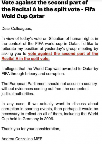 Η EURACTIV έχει στην κατοχή της ένα μήνυμα ηλεκτρονικού ταχυδρομείου που έστειλε ο Κοτσολίνο στην ομάδα S&D καλώντας τους συναδέλφους του να απορρίψουν μια τροπολογία που ισχυρίζεται ότι το Παγκόσμιο Κύπελλο ανατέθηκε στο Κατάρ από τη FIFA μέσω δωροδοκίας και διαφθοράς.