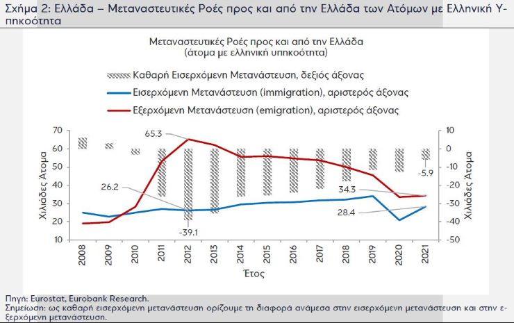 Σύμφωνα με την ανάλυση της Eurobank, η καθαρή μεταναστευτική εκροή των ατόμων με ελληνική υπηκοότητα σταδιακά φθίνει. Από τα 39.100 άτομα το 2012 μειώθηκε στα 5,9 χιλ. άτομα το 2021 (δεύτερος μικρότερος ρυθμός).