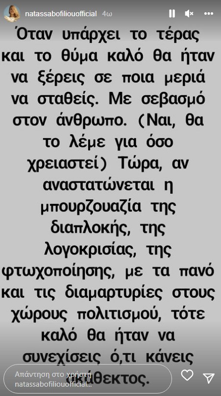 «Όταν υπάρχει το τέρας και το θύμα καλό θα ήταν να ξέρεις σε ποια μεριά να σταθείς. Με σεβασμό στον άνθρωπο. (Ναι, θα το λέμε για όσο χρειαστεί) Τώρα, αν αναστατώνεται η μπουρζουαζία της διαπλοκής, της λογοκρισίας, της φτωχοποίησης, με τα πανό και τις διαμαρτυρίες στους χώρους πολιτισμού, τότε καλό θα ήταν να συνεχίσεις ό,τι κάνεις ακάθεκτος».