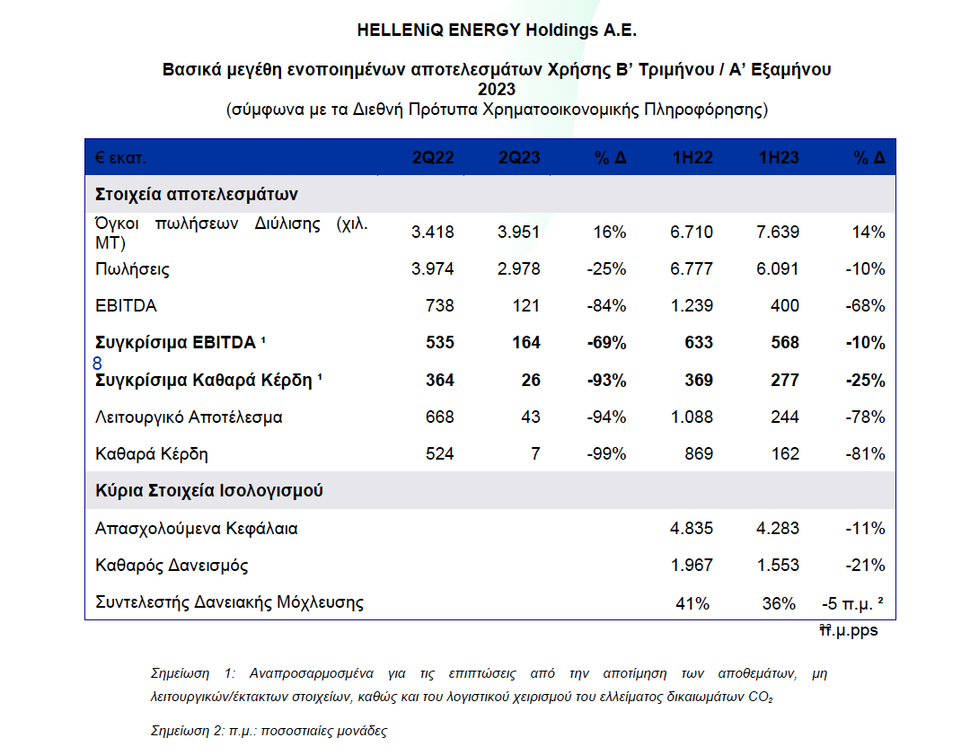 Η HELLENiQ ENERGY Holdings Α.Ε. («Εταιρεία») ανακοίνωσε τα ενοποιημένα οικονομικά αποτελέσματα Β’ Τριμήνου 2023, με τα Συγκρίσιμα Κέρδη EBITDA να διαμορφώνονται στα €164 εκατ. και τα Συγκρίσιμα Καθαρά Κέρδη στα €26 εκατ.. Συνολικά για το Α’ Εξάμηνο, τα Συγκρίσιμα Κέρδη EBITDA ανέρχονται σε €568 εκατ. και τα Συγκρίσιμα Καθαρά Κέρδη σε €277 εκατ., καταγράφοντας μια ακόμα θετική επίδοση του Ομίλου. Σημειώνεται ότι στα λειτουργικά αποτελέσματα δεν συμπεριλαμβάνονται τα αποτελέσματα ΔΕΠΑ και ELPEDISON που ενοποιούνται με τη μέθοδο της καθαρής θέσης. Τα αποτελέσματα στο Β’ Τρίμηνο επηρεάστηκαν από τα χαμηλά διεθνή περιθώρια διύλισης, ιδιαίτερα συγκρινόμενα με τα ιστορικά υψηλά της αντίστοιχης περσινής περιόδου. Η εξέλιξη αυτή περιόρισε τη βελτίωση στα οικονομικά αποτελέσματα από τις καλύτερες λειτουργικές επιδόσεις και την αυξημένη διαθεσιμότητα των 3 διυλιστηρίων. Συγκεκριμένα, οι πωλήσεις πετρελαιοειδών έφτασαν στους 3,95 εκατ. τόνους (+16%), με τις εξαγωγές να ενισχύονται κατά 28%, αντιπροσωπεύοντας το 54% των συνολικών όγκων πωλήσεων. Αντίστοιχα, αυξημένη συνεισφορά είχαν και οι ΑΠΕ, καθώς, μέσα από τις επενδύσεις τής τελευταίας διετίας έχει αυξηθεί σημαντικά η εγκατεστημένη βάση και η παραγωγή πράσινης ηλεκτρικής ενέργειας. Δελτίο Τύπου 31 Αυγούστου 2023 Empowering Tomorrow 8 Τα Δημοσιευμένα Καθαρά Κέρδη διαμορφώθηκαν στα €7 εκατ. στο Β’ Τρίμηνο 2023 (2022: €524 εκατ.) και στα €162 εκατ. στο Α’ Εξάμηνο 2023 (2022: €869 εκατ.). Η σημαντική μείωση των δημοσιευμένων αποτελεσμάτων αντικατοπτρίζει ευκρινώς την επίπτωση των τιμών και της αποτίμησης των αποθεμάτων ασφαλείας που καλείται να τηρεί και να χρηματοδοτεί η Εταιρεία. Συγκεκριμένα, η διαφορά εξ’ αυτού του λόγου, μεταξύ των δύο περιόδων ξεπερνά τα €700 εκατ., καθώς το Α’ Εξάμηνο 2023 ενσωματώνει ζημιές €197 εκατ. που αντιστρέφουν μέρος των €513 εκατ. που είχε η Εταιρεία ως κέρδη το Α’ Εξάμηνο 2022.