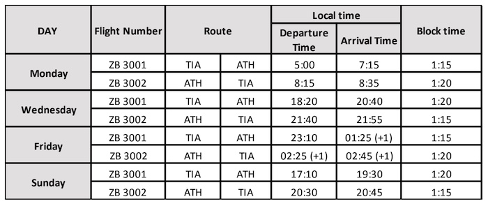 Η Air Albania πραγματοποιεί πτήσεις προς/από ΤΙΑ-ATH με 4 εβδομαδιαίες συχνότητες ΔΕΥ, ΤΕ, ΠΑ & ΚΥΡ αντίστοιχα.