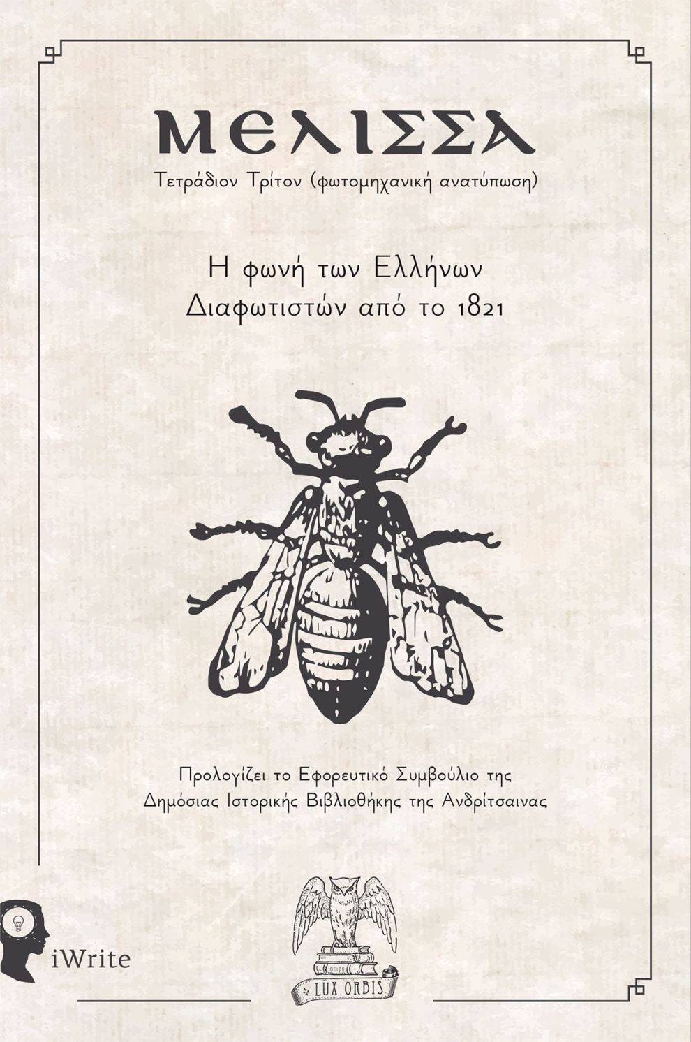 “Η επανακυκλοφορία του τρίτου τεύχους του περιοδικού “Μέλισσα” (εκδ. iWrite) από την Σειρά Lux Orbis, ως αυτόνομο έντυπο, 200 ολόκληρα χρόνια μετά την έκδοσή του στο Παρίσι, αποτελεί ένα σημαντικότατο γεγονός για την εγχώρια βιβλιοπαραγωγή του 2021. Το περιεχόμενο του βιβλίου μάς φέρνει σε άμεση επαφή με τις απόψεις και τις θέσεις των ριζοσπαστών Διαφωτιστών της εποχής, που εμπνέονταν σε μεγάλο βαθμό από το έργο του Αδαμάντιου Κοραή, τη χρονιά που η Επανάσταση ξεσπάει στον Μοριά.