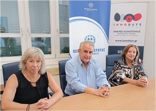 Σήμερα στο πλαίσιο παρουσίασης του τριημέρου καινοτομίας, ο αρμόδιος Αντιπεριφερειάρχης Κρήτης για θέματα επιχειρηματικότητας και καινοτομίας Αντώνης Παπαδεράκης, η προϊσταμένη της Ειδικής Υπηρεσίας Διαχείρισης Περιφέρειας Κρήτης Μαρία Κασσωτάκη, και η γενική διευθύντρια Αναπτυξιακού Προγραμματισμού Περιφέρειας Κρήτης Χρύσα Δασκαλάκη, αναφέρθηκαν στη σημαντικότητα του τριημέρου καινοτομίας.