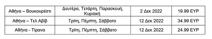 Οι νέες πτήσεις ξεκίνησαν από τον Διεθνή Αερολιμένα Αθηνών στις 2 Δεκεμβρίου, με την εγκαινίαση του νέου δρομολογίου προς την πρωτεύουσα της Ρουμανίας, το Βουκουρέστι, το οποίο αποτελεί και το πολιτιστικό, βιομηχανικό και οικονομικό κέντρο της χώρας.