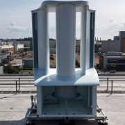 Η λευκή μονάδα αποτελείται από κάθετες αεροτομές που δημιουργούν ένα φαινόμενο κενού, τραβώντας τον άνεμο πίσω από έναν εσωτερικό έλικα για την παραγωγή ηλεκτρικής ενέργειας.