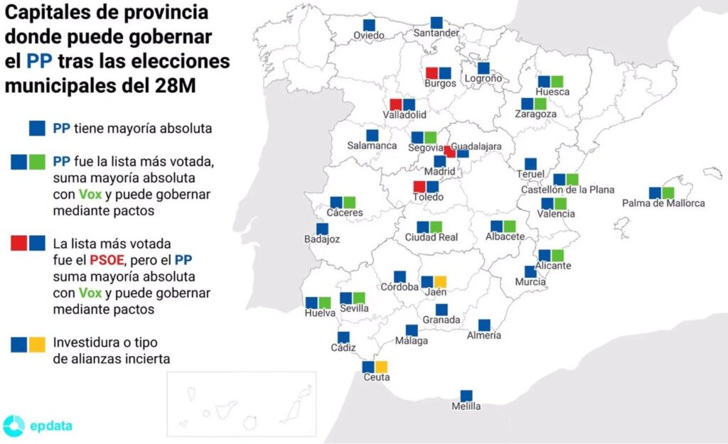 Με βάση τα αποτελέσματα, θα κυβερνήσει πλέον σε 32 από τις 50 πρωτεύουσες νομών (Εικόνα 1), καθώς επίσης και στις 9 από τις 12 περιφέρειες (Εικόνα 2) στις οποίες διεξήχθησαν εκλογές, είτε αυτοδύναμα (Μαδρίτη, Λα Ριόχα και Μούρθια) είτε σε συνεργασία με τοπικά κόμματα ή και με το κόμμα VOX.