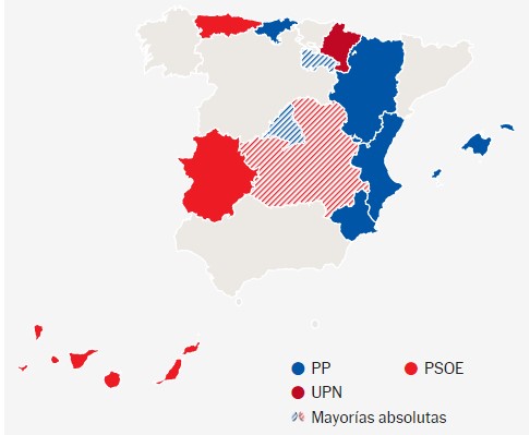 Εικόνα 2: Ο χάρτης απεικονίζει τα κόμματα που κέρδισαν τη σχετική (συμπαγές χρώμα) ή την απόλυτη (σκιώδες χρώμα) πλειοψηφία εδρών στις πρόσφατες ισπανικές περιφερειακές εκλογές. Με μπλε χρώμα, οι Περιφέρειες στις οποίες επικράτησε το Λαϊκό Κόμμα, με κόκκινο εκείνες στις οποίες επικράτησε το PSOE ή συνεργαζόμενα κόμματα και με γκρι αυτές στις οποίες δεν διεξήχθησαν φέτος περιφερειακές εκλογές.
