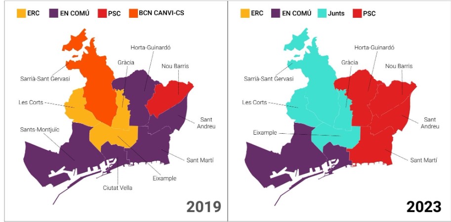 Εικόνα 3: Το πρώτο κόμμα σε κάθε γειτονιά του δήμου της Βαρκελώνης στις δημοτικές εκλογές του 2019 και του 2023, αντίστοιχα. Με κόκκινο χρώμα οι περιοχές στις οποίες επικράτησε ο σοσιαλιστής υποψήφιος, με κίτρινο και θαλασσί οι Καταλανοί εθνικιστές, με πορτοκαλί οι κεντροδεξιοί Ciudadanos και με μωβ η υποψήφια της Αριστεράς Άντα Κολάου. Από το 2019 έως το 2023 τα ανώτερα στρώματα συνασπίστηκαν υπέρ του Τριάς, ενώ η ψήφος των κατοίκων των εργατικών συνοικιών «μοιράστηκε» σε Αριστερούς και Σοσιαλιστές.