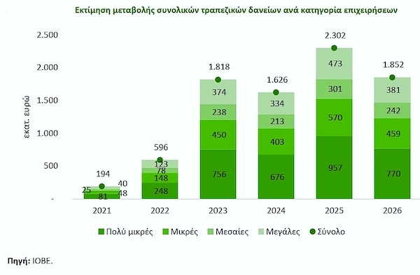Για τις πολύ μικρές επιχειρήσεις, η αύξηση του συνολικού τραπεζικού δανεισμού εκτιμάται ότι θα κυμανθεί από €248 εκατ. έως €957 εκατ., που αντιπροσωπεύει το 42% της συνολικής αύξησης. Οι μικρές επιχειρήσεις συγκεντρώνουν το 25%, οι μεσαίες το 13% και οι μεγάλες το 21% της συνολικής αύξησης του καθαρού τραπεζικού δανεισμού.