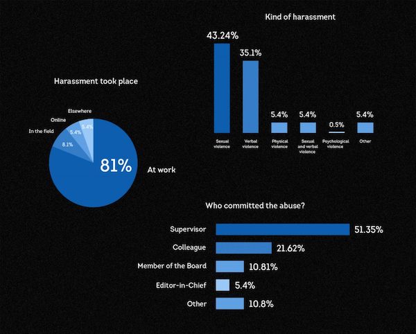 Σύμφωνα με τις απαντήσεις τους σε ερωτηματολόγιο, το 81% έχουν πέσει θύμα κακοποίησης ή παρενόχλησης ενώ εργάζονταν, με το 51% των θυτών να είναι ιεραρχικά ανώτεροι.
