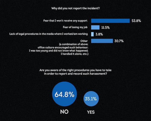 Περισσότερες από τις μισές δεν έκαναν καμιά αναφορά σε ό, τι βίωσαν. Αναλυτικότερα, το 53,8% των θυμάτων δεν ανέφερε το περιστατικό από φόβο ότι δεν θα λάβει καμία υποστήριξη και το 11,5% γιατί φοβήθηκε ότι θα χάσει τη δουλειά του.