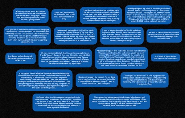 Η 33χρονη Ζωή θυμάται την εμπειρία της σε γνωστό ραδιοφωνικό σταθμό: «Ο 55χρονος διευθυντής ειδήσεων μας στρίμωχνε στις γωνίες και μας άγγιζε, άλλοτε είχε εκρήξεις θυμού και μας απέλυε… Αργότερα, η αρχισυντάκτριά μου με αποκαλούσε ηλίθια. Μου το είχε πει τόσες φορές που στο τέλος το είχα πιστέψει», δήλωσε.