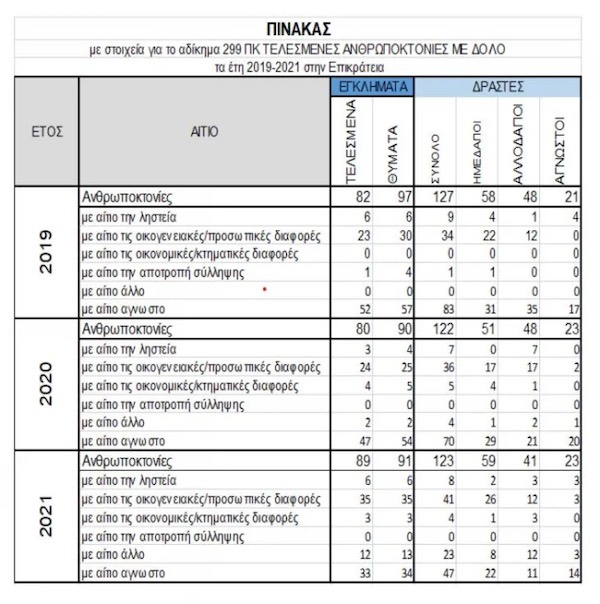 Στις 24 Φεβρουαρίου ζήτησε από την ΕΛΑΣ όλα τα διαθέσιμα στατιστικά στοιχεία που κρατάει η αρμόδια υπηρεσία της σχετικά με τις ανθρωποκτονίες την τελευταία τριετία (ανά μήνα). Ενδεικτικά ζήτησε νούμερα ανά εθνικότητα θύματος, φύλο, ηλικία, αιτία. Στις 14 Μαρτίου ως απάντηση πήρε τον παρακάτω συνοπτικό πίνακα: