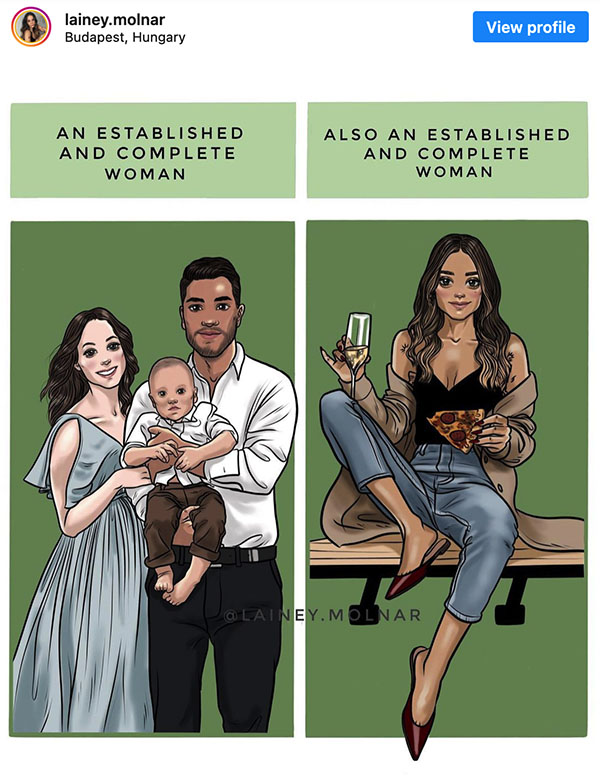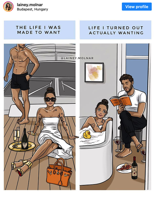 Μέσα από τα illustrations της κάνει σαφές πως το concept της ευτυχίας για μια γυναίκα δεν είναι άρρηκτα συνυφασμένο με έναν γάμο και ένα νυφικό. Ένας σκύλος μπορεί να δώσει το ίδιο μερίδιο στην ολοκλήρωση. Αν υπάρχει αυτή τέλος πάντων και δεν πρόκειται για ακόμα ένα ψέμα για να νιώθουμε μονίμως ανολοκλήρωτοι. Κάνει σαφές πως ο μεταβολισμός αλλάζει και πως το κυνήγι του «τέλειου σώματος» είναι από εκείνα που θα σε αφήνουν πάντα στο τρέξιμο. Εξηγεί πως κάποιες φορές, στη θέα ενός παιδιού, μια γυναίκα μπορεί να κάνει την ακαριαία σκέψη να στειρωθεί γιατί μάντεψε, δεν είναι cute τα παιδάκια για όλες εκεί έξω. Και αυτό είναι ΟΚ.