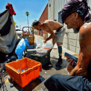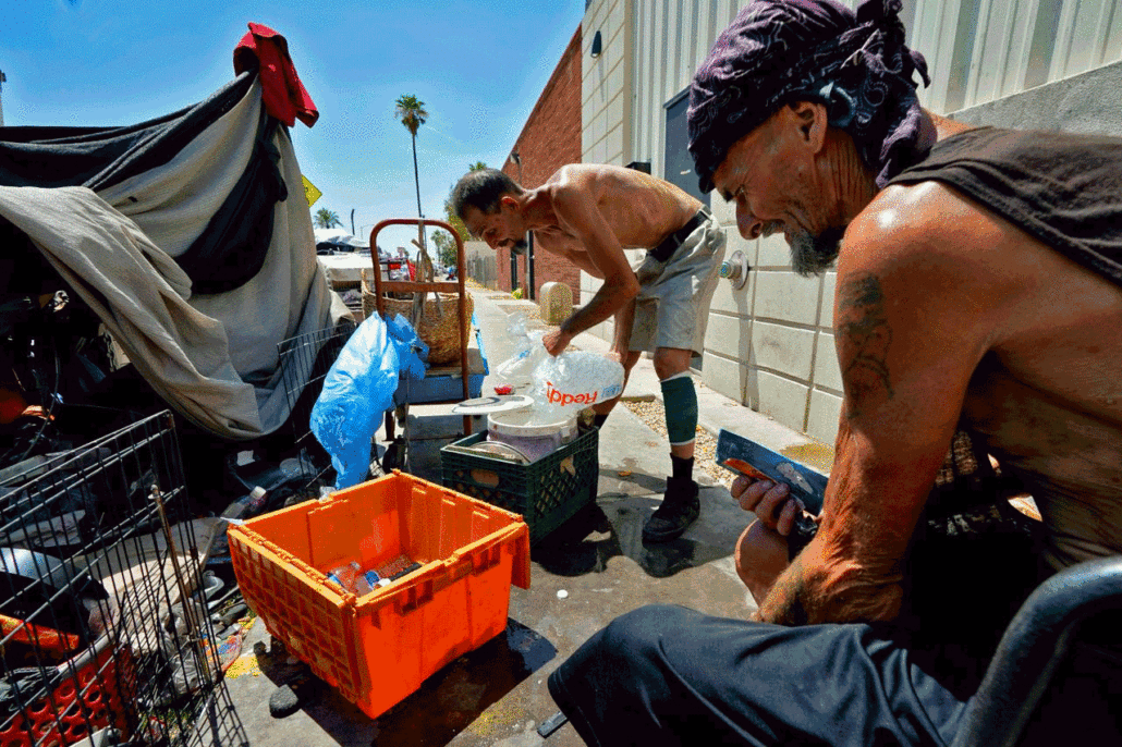 Δύο άστεγοι με πάγο στις 14 Ιουλίου 2023 στο κέντρο του Φοίνιξ, ο οποίος έφτασε τους 112 βαθμούς εκείνη την ημέρα, σηματοδοτώντας τη 15η συνεχόμενη ημέρα της πόλης με θερμοκρασίες άνω των 110 βαθμών. [AP Photo/Matt York]