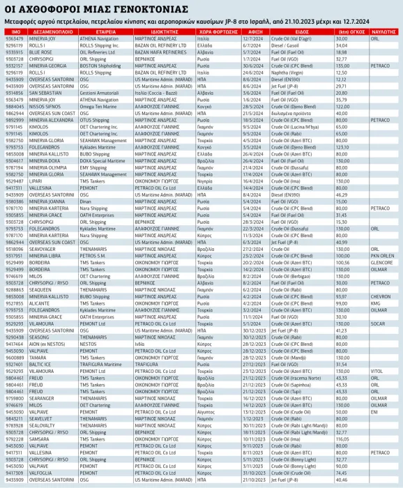 Ερευνα της βρετανικής Data Desk εντόπισε 65 αποστολές πετρελαίου και καυσίμων προς το Ισραήλ μετά τις 20 Οκτωβρίου του περασμένου έτους και έως τις 15 Ιουλίου φέτος, οι περισσότερες εκ των οποίων εξυπηρετήθηκαν από δεξαμενόπλοια ελληνικής ιδιοκτησίας ή διαχείρισης.