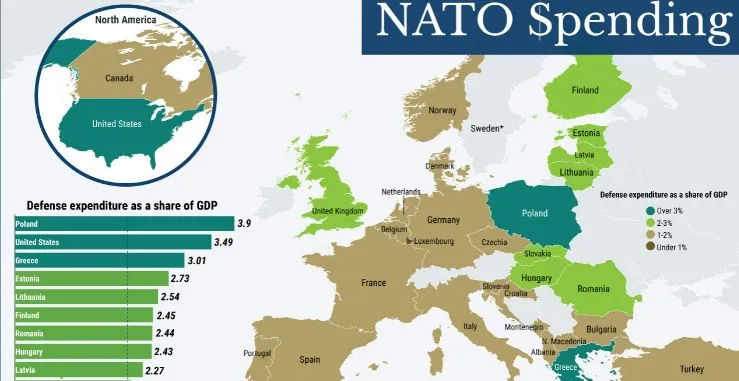 Το 2023, η Πολωνία υπερέβη το όριο, διαθέτοντας πάνω από το 3% του ΑΕΠ της στην άμυνα, κυρίως σε εξοπλισμό. Άλλα κράτη της Ανατολικής Ευρώπης κατά μήκος της πρώτης γραμμής με τη Ρωσία έχουν ενεργήσει παρόμοια. Εν τω μεταξύ, οι ΗΠΑ ήταν ιστορικά ο μεγαλύτερος συνεισφέρων στην άμυνα του ΝΑΤΟ. Όμως η Δυτική Ευρώπη, παρά τη σημαντική συνεισφορά της στην άμυνα της Ευρώπης, δεν έχει επιτύχει σταθερά τον στόχο του 2%.
