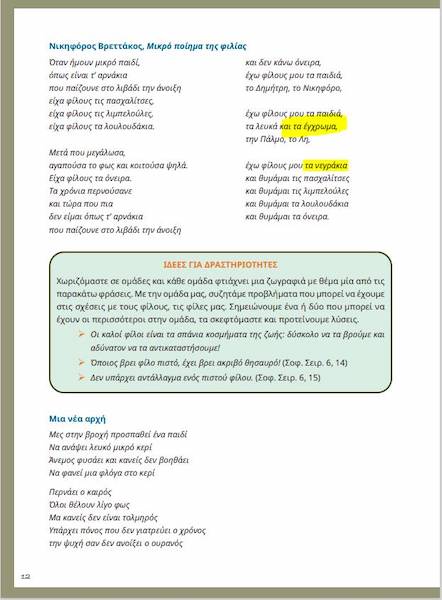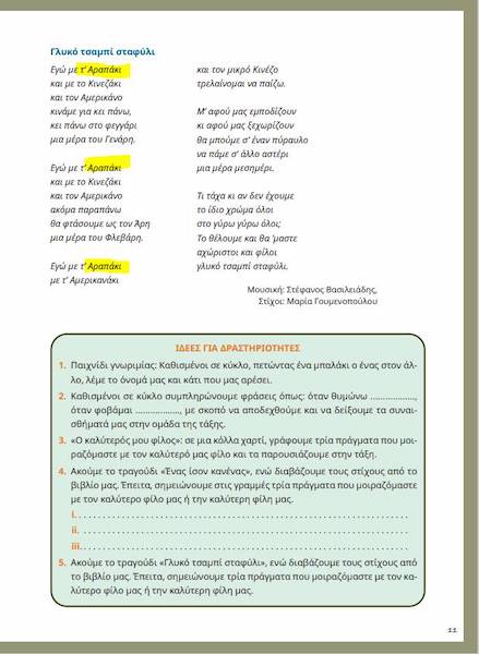 Με έκπληξη διαπιστώσαμε ότι στο μάθημα των θρησκευτικών της τρίτης δημοτικού και μάλιστο στο κεφάλαιο για τη φιλία, διδάσκονται τα ποιήματα «Μικρό ποίημα της φιλίας» του Νικηφόρου Βρεττάκου και το «Γλυκό τσαμπί σταφύλι» της Μαρίας Γουμενοπούλου, τα οποία συμπεριλαμβάνουν τις λέξεις «νέγρος», «έγχρωμος», «αράπης», «μαυράκι».