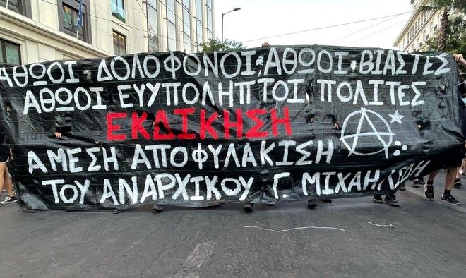 Αναίτια βία της αστυνομίας στην πορεία συμπαράστασης στον Γιάννη Μιχαηλίδη που πραγματοποιείται μετά την απόρριψη του αιτήματος του απεργού πείνας για αποφυλάκιση από το συμβούλιο Εφετών Λαμίας και μετά την ραγδαία επιδείνωση της υγείας του την Πέμπτη (28/7).