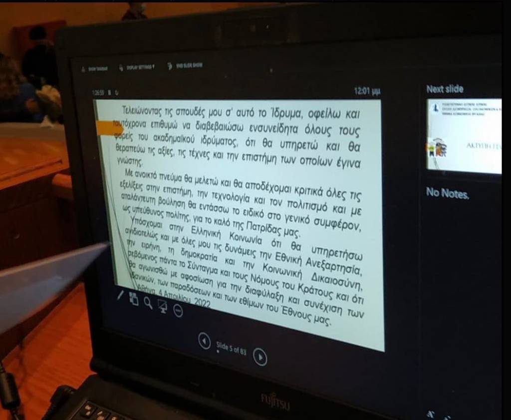 *περιγραφή φωτογραφίας για τυφλά άτομα: Πίσω διαφαίνεται το αμφιθέατρο, είναι φωτογραφία του λάπτοπ με την παρουσίαση που έγινε κατά την ορκομωσία και υπάρχει σε αυτή το περιεχόμενο του όρκου με το κείμενο που ακολουθεί: «Τελειώνοντας τις σπουδές μου σε αυτό το ίδρυμα, οφείλω και ταυτόχρονα επιθυμώ να διαβεβαιώσω ενσυνείδητα όλους τους φορείς του ακαδημαϊκού ιδρύματος, ότι θα υπηρετώ και θα θεραπεύω τις αξίες, τις τέχνες και την επιστήμη των οποίων έγινα γνώστης. Με ανοικτό πνεύμα θα μελετώ και θα αποδέχομαι κριτικά όλες τις εξελίξεις στην επιστήμη, την τεχνολογία και τον πολιτισμό και με αταλαντευτη βούληση θα εντασσω το ειδικό στο γενικό συμφέρον, ως υπεύθυνος πολίτης για το καλό της Πατρίδας μας. Υπόσχομαι στην Ελληνική Κοινωνία ότι θα υπηρετήσω ανιδιοτελώς με όλες μου τις δυνάμεις την Εθνική Ανεξαρτησία, την ειρήνη, την δημοκρατία και την Κοινωνική Δικαιοσύνη, σεβόμενος πάντα το Σύνταγμα και τους Νόμους του Κράτους και ότι θα αγωνισθώ με αφοσίωση για την διαφύλαξη και συνέχιση των ιδανικών, των παραδόσεων και των εθίμων του Έθνους μας. Αθήνα, 4 Απριλίου 2022»