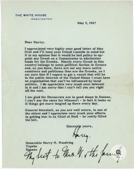 Είναι γνωστό ότι ο πρόεδρος Τρούμαν διέπραξε ένα από τα μεγαλύτερα εγκλήματα πολέμου στην ανθρώπινη ιστορία με τον πυρηνικό βομβαρδισμό της Χιροσίμα και του Ναγκασάκι. Αυτός λοιπόν ο πρόεδρος, που χαίρει άκρας εκτίμησης από την ελληνική άρχουσα τάξη, εξέφραζε βαθιά ρατσιστικές θέσεις εναντίον των Ελλήνων, όπως προκύπτει από επιστολή του προς τον πρώην υπουργό πολέμου των ΗΠΑ, Harry H. Woodring που παρουσιάζει το ίδρυμα Shapell.