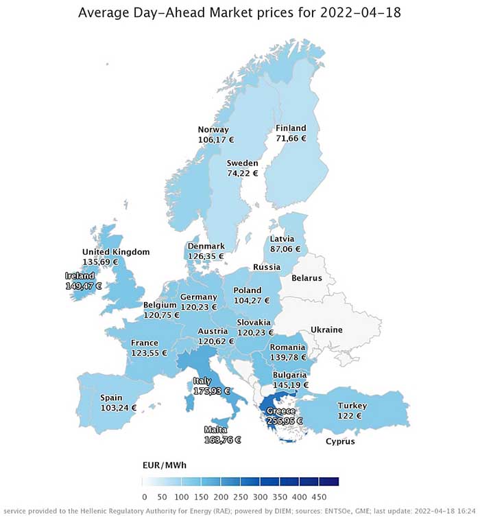 Η χονδρική τιμή στην Ελλάδα εκτινάχθηκε σήμερα στα 255,95 ευρώ ανά μεγαβατώρα, ενώ στην Ιταλία διαμορφώθηκε στα 175,93 ευρώ και στις άλλες χώρες της ΕΕ είναι πολύ χαμηλότερη. Αυτή η τεράστια απόκλιση σημειώνεται παρά το γεγονός ότι η Ιταλία είναι μία από τις διασυνδεδεμένες με την Ελλάδα αγορές.