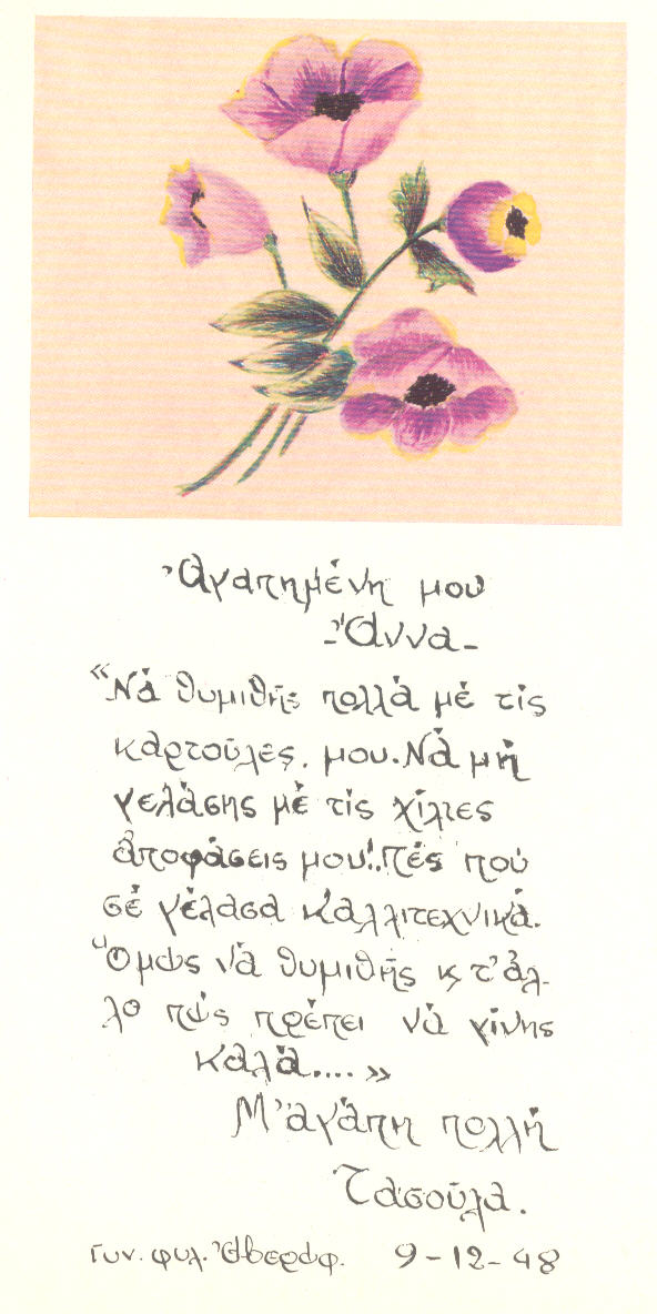 Αγαπημένη μου κορούλα, για τα γενέθλιά σου σου στέλνω πολλές πολλές-ευχές. Ο πατερούλης σου Θανάσης. Αη Στράτης 22–9‑54