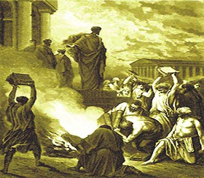 Οι αρχαίοι Αθηναίοι, λοιπόν, έκριναν, ως βλάσφημο και έκαψαν το έργο του Πρωταγόρα Περί θεών. Ο Μέγας Αλέξανδρος πυρπόλησε πάνω από 12.000 περσικά πρωτότυπα, μεταξύ των οποίων και το θρησκευτικό κείμενο Αβέστα. Οι πρώτοι Άραβες έκαιγαν κάθε βιβλίο, αφού το Κοράνι τα είχε πει όλα, ο θρησκευτικός ηγέτης της Φλωρεντίας τον 15ο αι. Σαβοναρόλα παρέδιδε στην πυρά αρχαίες περγαμηνές, ενώ ο Λούθηρος έκαιγε δημοσίως τις εντολές του Πάπα.
