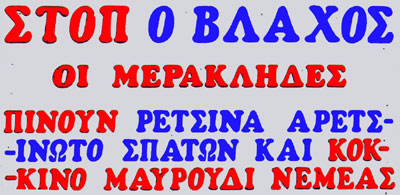 Στην πινακίδα τού κρεοπωλείου τής παραπάνω φωτογραφίας, ο ιδιοκτήτης του είναι προφανώς περήφανος για τη βλάχικη καταγωγή του, αλλά ταυτόχρονα τοποθετεί και τη νεοελληνική σημαία, δηλώνοντας έτσι την ψευδαίσθησή του, ότι είναι δήθεν απόγονος των αρχαίων ελλήνων, όπως εξ άλλου πιστεύουν οι περισσότεροι από τούς ομοεθνείς του στη σημερινή Ελλάδα. Αντίθετα, οι βλάχοι άλλων χωρών (Αλβανίας, Π.Γ.Δ.Μ. κ.ά.) έχουν ενσωματωθεί στο εκεί τοπικό στοιχείο και δεν έχουν καμμία ψευδαίσθηση περί δήθεν αρχαιοελληνικής καταγωγής.