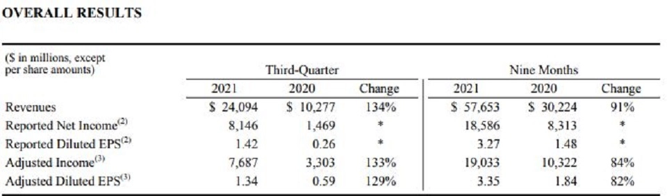 Σταθερά ανοδική πορεία ακολουθεί η Pfizer, όπως διαφαίνεται και από τα οικονομικά αποτελέσματα τρίτου τριμήνου, με άνοδο των εσόδων στα 24,1 δισ. δολάρια και προσαρμοσμένα κέρδη στο 1,34 δολάρια ανά μετοχή (συμπεριλαμβανομένων και των μετατρέψιμων τίτλων). Τα έσοδα της εταιρείας εξαιρώντας το εμβόλιο της Pfizer – BioNTech, το Comirnaty, ενισχύθηκαν κατά 7% στα 11,1 δισ. δολάρια. Η εταιρεία αναμένει πως για ολόκληρο το έτος θα έχει τζίρο μεταξύ 81 και 82 δισ. δολαρίων και πρσαρμοσμένα κέρδη από 4,13 δολάρια έως 3,18 δολάρια ανά μετοχή. Σε ετήσια βάση, πρόκειται ουσιαστικά για αύξηση 94% και 84% αντίστοιχα.