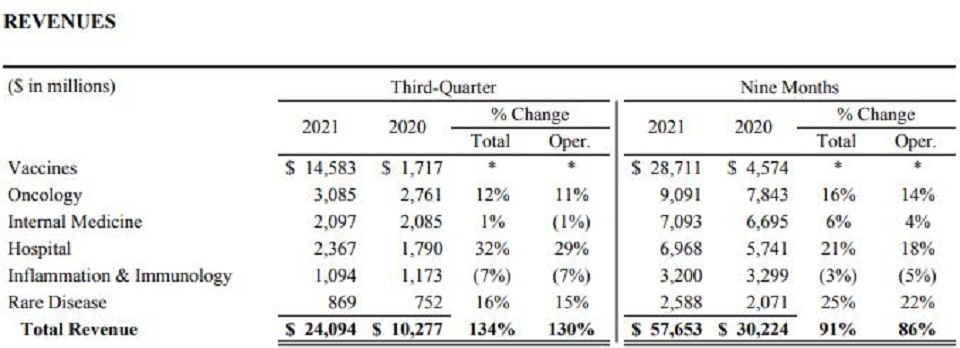 Μεγαλύτερη αύξηση των εσόδων σε ετήσια βάση καταγράφηκε στον τομέα των εμβολίων. Τα έσοδα ανήλθαν σε 1.717 δισ. δολάρια το τρίτο τρίμηνο 2020, ενώ το αντίστοιχο τρίμηνο του 2021 εκτοξεύθηκαν στα 14,583 δισ. δολάρια. Όσον αφορά τους πρώτους εννιά πρώτους μήνες του 2021, τα έσοδα από τον κλάδο των εμβολίων διαμορφώθηκαν στα 28.711 δισ. δολάρια, ενώ το αντίστοιχο ποσό για την περίοδο Ιανουαρίου Σεπτεμβρίου του 2020 έφτανε τα 4.574 δισ. δολάρια.