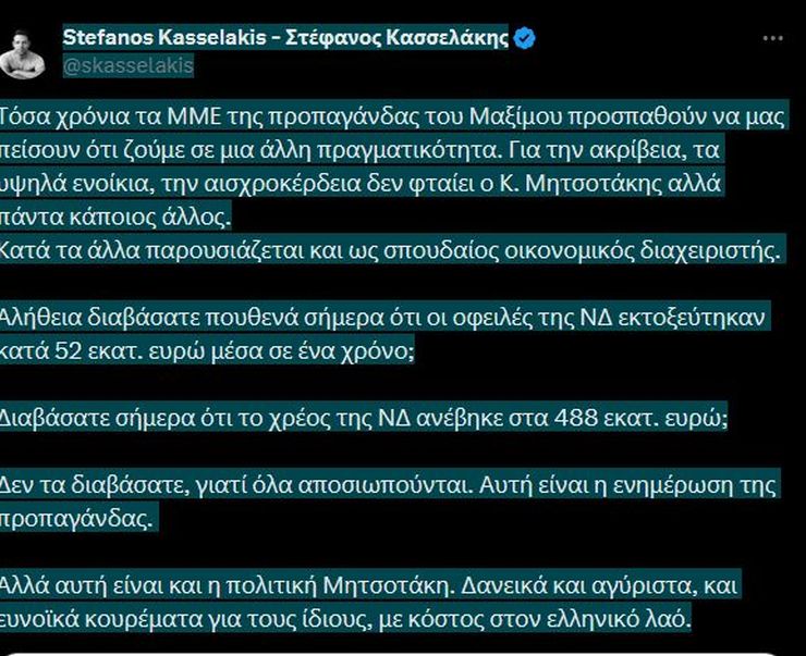 Στο θέμα αναφέρθηκε και ο πρόεδρος του ΣΥΡΙΖΑ Στέφανος Κασσελάκης σε ανάρτηση του στο Χ: